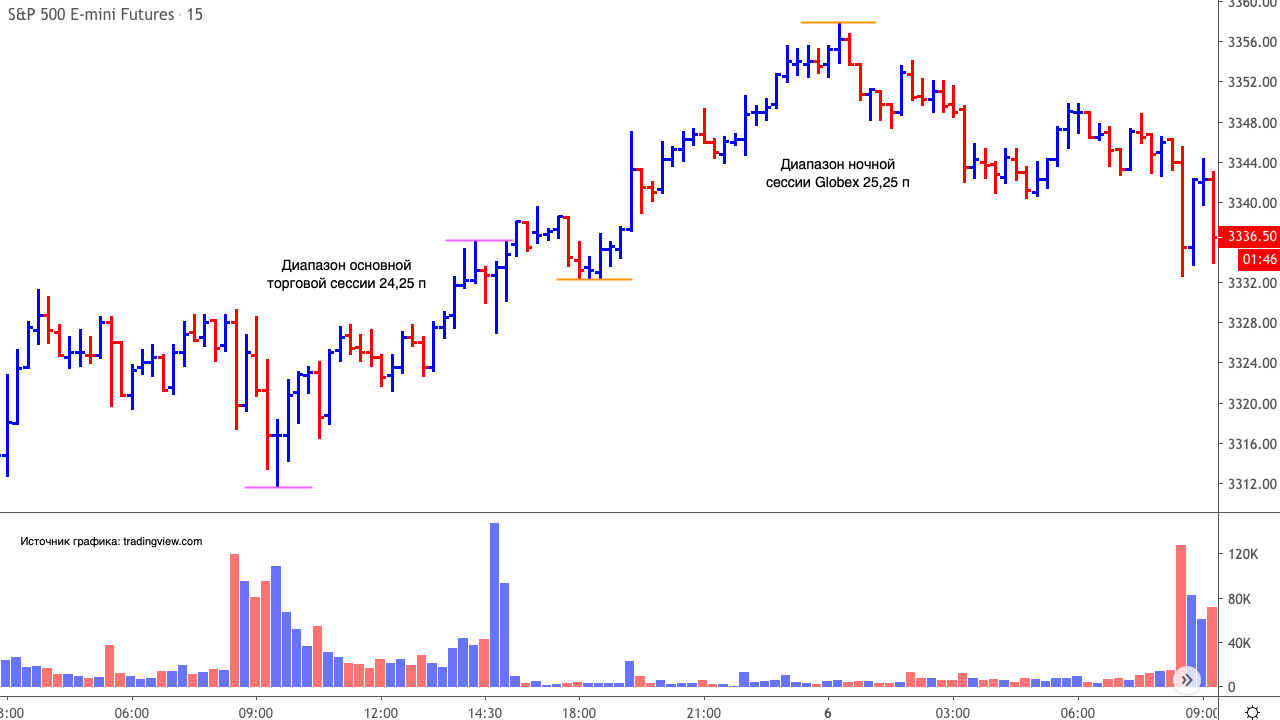- Ночная сессия Globex даёт контекст с чего начать в начале новой дневной сессии с учётом всего произошедшего за ночь. Фьючерс на индекс S&P 500 торгуется практически круглосуточно. За счёт этого в начале дневной торговой сессии проще проводить анализ графика. Торги нового дня не начинаются с резкого гэпа, если только это не начало торговой недели после выходных дней.